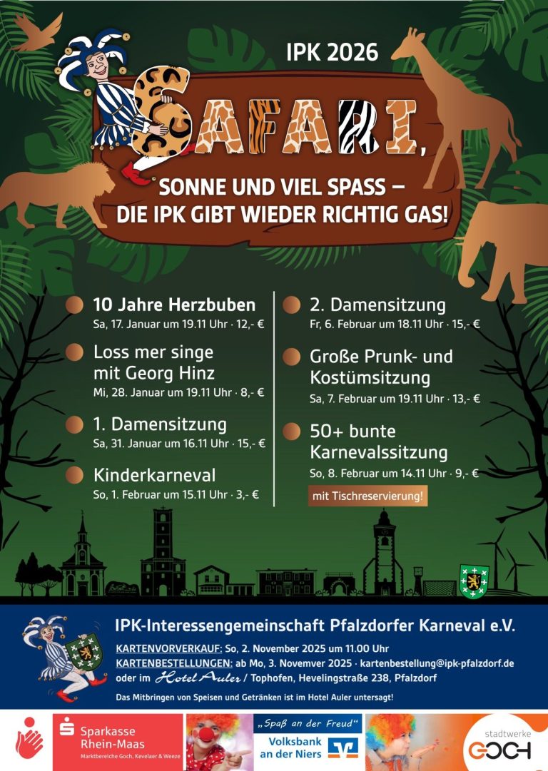 Die IPK geht 2026 auf große Safari – mit Sonne, Spaß und einer ordentlichen Portion Karnevalsgas! Unter unserem Dschungel-Motto warten wilde Abende, bunte Sitzungen und jede Menge beste Laune auf euch. Ob bei stimmungsvoller Musik, glitzernden Kostümen oder lautem Kinderlachen – wir machen Pfalzdorf wieder zur Karnevalshochburg.